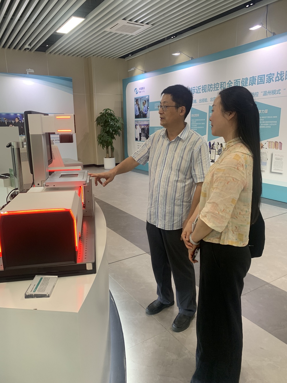 2022年7月25日,作家曹凌云(中)在中電???溫州光電產(chǎn)業(yè)創(chuàng)新聯(lián)合體參觀各類產(chǎn)品。