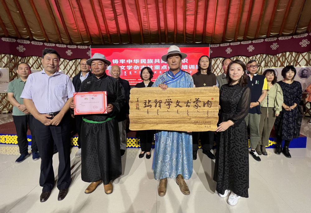 7月26日,在錫林郭勒盟正鑲白旗舉行的“鑄牢中華民族共同體意識(shí)·內(nèi)蒙古文學(xué)雜志社重點(diǎn)作家培訓(xùn)班開班儀式”上,正鑲白旗伊克淖爾蘇木阿日善嘎查黨支部書記、嘎查長蘇德,從內(nèi)蒙古文學(xué)雜志社社長賈翠霞手中接過“內(nèi)蒙古文學(xué)驛站”牌匾,標(biāo)志著內(nèi)蒙古文學(xué)雜志社首個(gè)文學(xué)驛站誕生。隨后的7月29日,第二個(gè)“內(nèi)蒙古文學(xué)驛站”在錫林郭勒盟正藍(lán)旗設(shè)立。