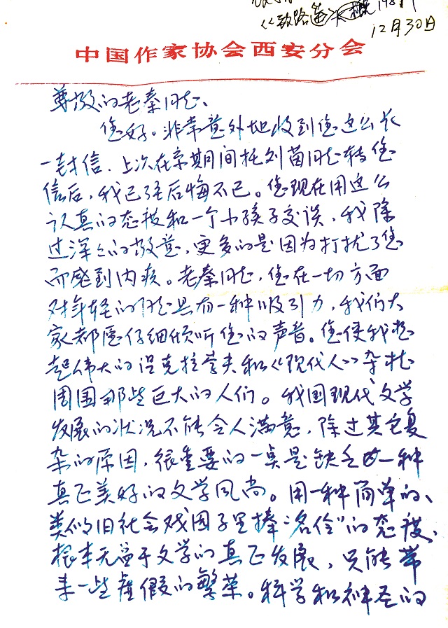您好。非常意外地收到您這么長一封信。上次在京期間托劉茵同志轉您信后,我已經(jīng)后悔不已。您現(xiàn)在用這么認真的態(tài)度和一個小孩子交談,我除過深深的敬意,更多的是因為打擾了您而感到內(nèi)疚。老秦同志,您在一切方面對年輕的同志具有一種吸引力,我們大家都愿仔細傾聽您的聲音。您使我想起偉大的涅克拉索夫和《現(xiàn)代人》雜志周圍那些巨大的人們。我國現(xiàn)代文學發(fā)展的狀況不能令人滿意,除過其它復雜的原因,很重要的一點是缺乏一種真正美好的文學風尚。用一種簡單的、類似舊社會戲園子里捧“名伶”的態(tài)度,根本無益于文學的真正發(fā)展,只能帶來一些虛假的繁榮??茖W和神圣的東西讓一些嘻皮笑臉的人操持怎么能讓人不寒心呢?在這樣一種情況中,一個嚴肅的、熱情的、不看門第而竭盡全力真正關懷文學事業(yè)發(fā)展的人,他所發(fā)出的聲音——站在山巔上發(fā)出的獨特的、深沉的哲人和詩人的聲音,對文學公眾的吸引力是無可比擬的,因為這一切在我們的環(huán)境中是寶貴的。