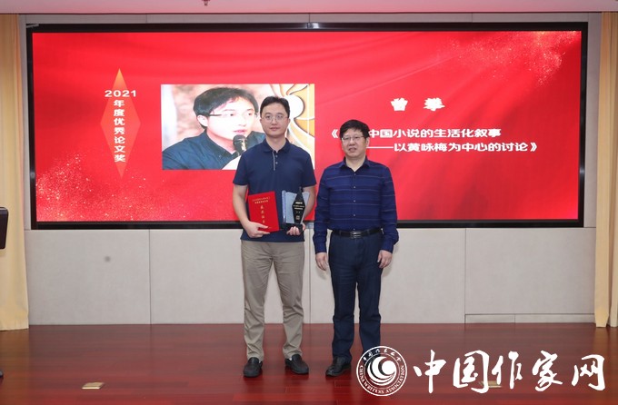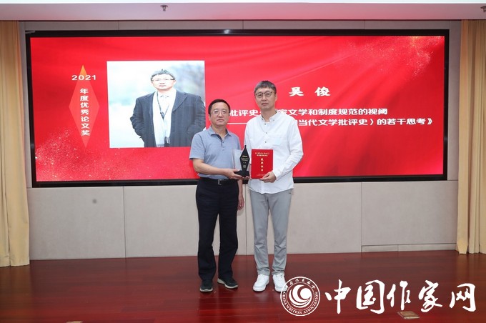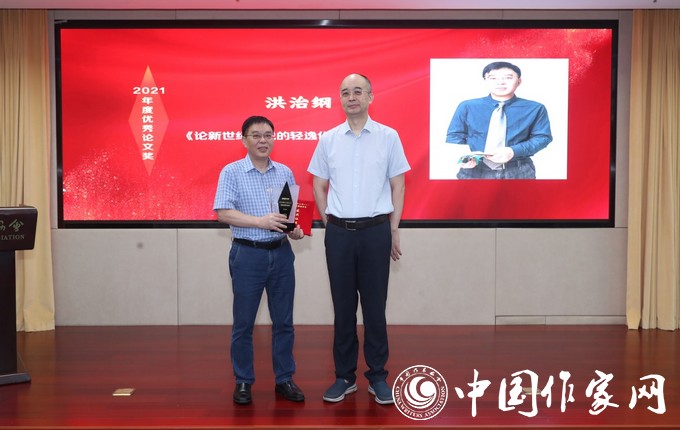 吳義勤為洪治綱頒發(fā)獲獎證書及獎杯