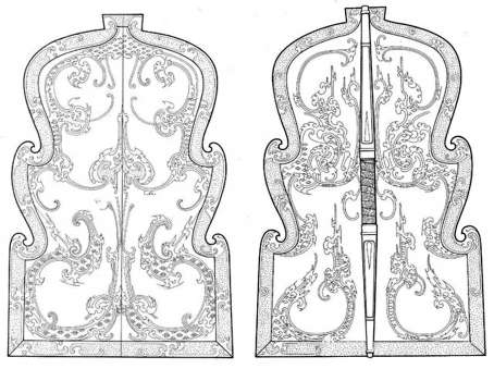 《周禮·夏官》說周到有“五兵五盾”,具體是哪五種盾則不太清楚。除了車盾、步盾外,應該還有一種專門用來樂舞的舞盾。兩周之際出現(xiàn)了一種新的盾牌形制,兩側呈弧形,更加貼近人體生理特征,也就是戰(zhàn)國秦漢最為流行的“雙弧盾”?!半p弧盾”不少繪制有精美的漆繪,如湖南長沙五里牌戰(zhàn)國楚墓中,就出土了兩面非常精美的皮制漆盾,表面用赭石和藤黃雙色繪制出龍鳳花紋。這些盾牌都不會是作戰(zhàn)使用,而只在貴族宴會上供舞者使用。