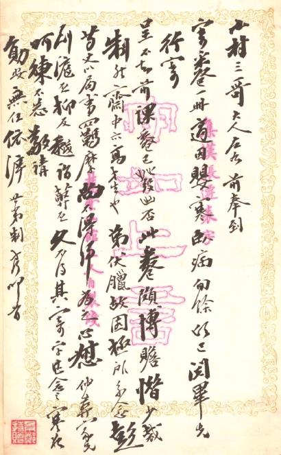陶氏于光緒五年(1879)四月任湖南學(xué)政,其使用的“守如上言”花箋,應(yīng)是當(dāng)?shù)匚挠殃愂赜匏洝9饩w六年(1880)六月,他因母喪守制卸任返鄉(xiāng)。札中有“弟伏臘故園極所系念。彭芍丈以局事羈縻,尚不得歸,為之心惄?!痹圃疲馑际撬芟牖剜l(xiāng),但湖南巡撫彭祖賢以“局事”(修通志局之事)相“羈縻,尚不得歸”。因此,這封信札是陶方琦在光緒六年六月卸任之前所寫,據(jù)札中“適因嬰寒,臥病旬余”“寒夜呵凍”等語,知此札系年當(dāng)為光緒五年末到六年初之間。