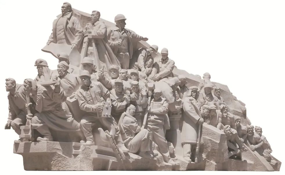邁入西側(cè)廣場,莊嚴(yán)矗立的5座大型主題雕塑,給人以視覺震撼和精神力量——《旗幟》“迎風(fēng)招展”、氣勢如虹;《信仰》《偉業(yè)》《攻堅(jiān)》《追夢》4組雕塑渾然一體、巍峨壯觀。583塊來自四川夾金山腳下的漢白玉,雕刻成276個栩栩如生的人物,匯聚為波瀾壯闊的視覺史詩,生動講述著黨的百年光輝歷程。它們是新時代美術(shù)工作者為人民放歌、為時代鑄魂的典范之作。