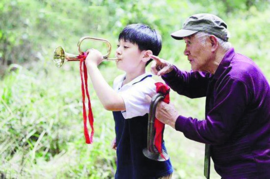 首先,影片建構(gòu)了一個(gè)歷史與現(xiàn)實(shí)相互鏈接,祖輩與孫輩思想、情感傳承并相互認(rèn)同的獨(dú)特?cái)⑹驴臻g和人物關(guān)系鏈條。導(dǎo)演選取這樣獨(dú)特的視角和題材,緊扣當(dāng)下城市孩子普遍缺乏體力、意志力鍛煉,并且較為任性、以自我為中心、缺乏集體協(xié)作感等現(xiàn)實(shí)問題,通過寓教于樂的方式使孩子們自然而然接受紅色革命歷史教育、傳承紅色基因。我們看到,影片為觀眾建構(gòu)了爺爺和孫子這一對特殊的人物關(guān)系,這種關(guān)系與紅色基因的傳承同聲相應(yīng),也在當(dāng)下主場景影像敘事中植入了歷史閃回的景觀敘事。由表演藝術(shù)家牛犇飾演的爺爺鄭紅兵,長期堅(jiān)持居住在山中老屋,他珍藏著那把父親傳承下來的老軍號,并向人們不斷講述過往的革命歷史,他對于老屋和老軍號的堅(jiān)守不乏象征意義。孫子與爺爺圍繞軍號展開故事沖突,孫子對于老軍號由不理解到理解,也是對爺爺由不理解到理解的思想、情感蛻變過程。