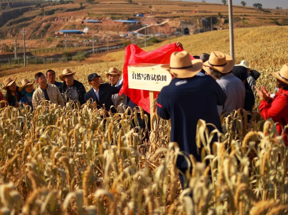 在萬(wàn)畝粟米田中,“自然寫(xiě)作試驗(yàn)田”在大家的見(jiàn)證下揭開(kāi)紅綢,在沉甸甸的谷穗簇?fù)硐蚂陟谏x。“小香米”品牌創(chuàng)始人劉三堂向大家分享了培育小香米的過(guò)程,隨后一聲“開(kāi)鐮了”,他率先開(kāi)始收割,作家、藝術(shù)家們也緊隨其后開(kāi)始收割?,F(xiàn)場(chǎng),作家、藝術(shù)家們還自發(fā)分成5組,進(jìn)行收割比賽。有躬身收割的,有打捆的,有搬運(yùn)的……一片歡快忙碌的景象。