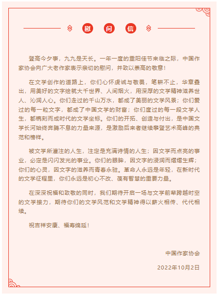 為進(jìn)一步弘揚(yáng)中華民族孝親敬老傳統(tǒng)美德,關(guān)愛(ài)和致敬德高望重的前輩作家,營(yíng)造敬老尊賢的良好風(fēng)氣和文學(xué)薪火代代相傳的良好氛圍,在一年一度的重陽(yáng)佳節(jié)來(lái)臨之際,中國(guó)作家協(xié)會(huì)向全國(guó)廣大老作家發(fā)出重陽(yáng)慰問(wèn)信,并以委托團(tuán)體會(huì)員單位走訪、致電等多種形式,集體慰問(wèn)95歲以上的中國(guó)作協(xié)會(huì)員,向他們致以真誠(chéng)的節(jié)日問(wèn)候和崇高的敬意。中國(guó)作協(xié)黨組書記處同志陸續(xù)走訪慰問(wèn)部分在京高齡作家。