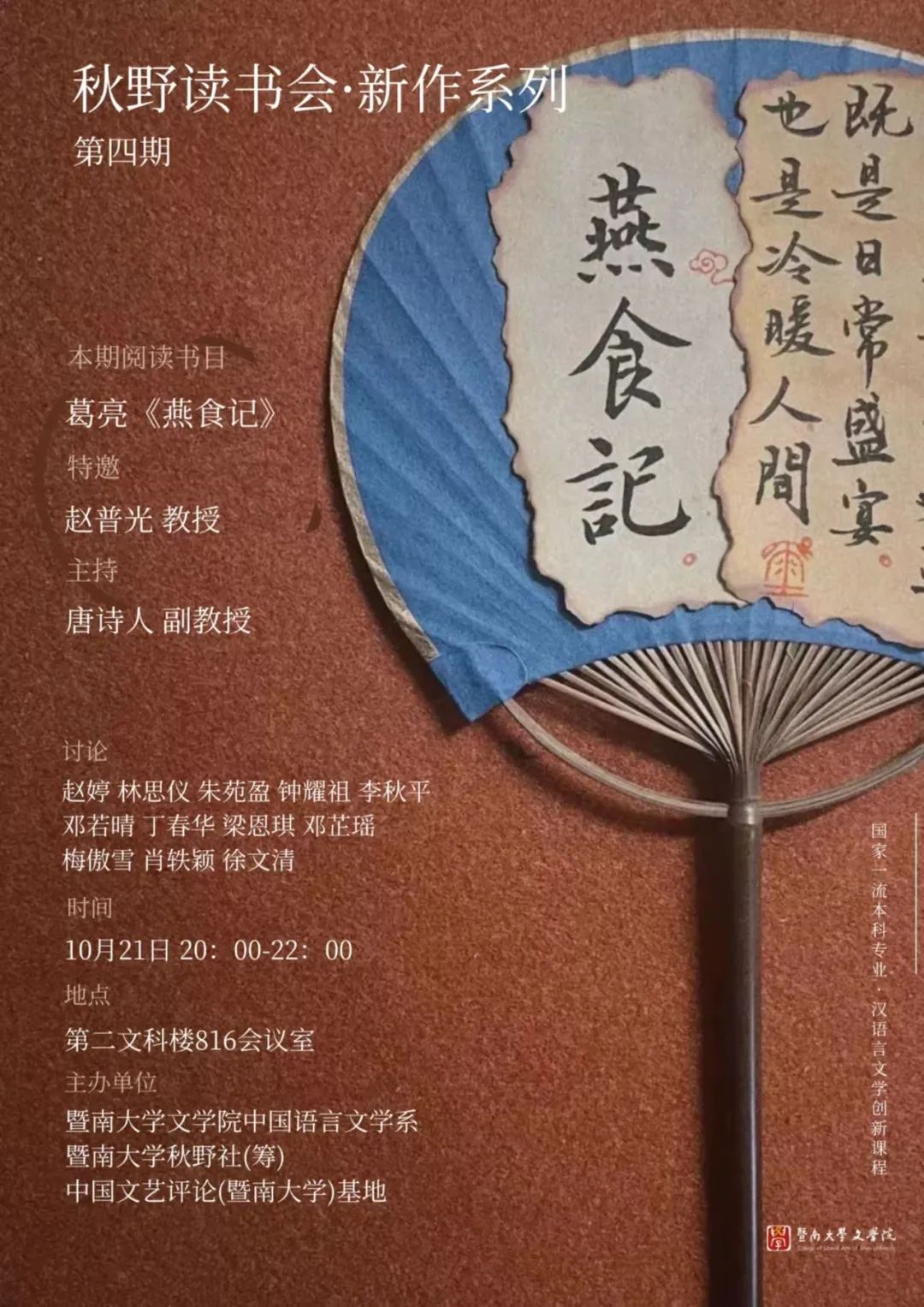 自2022年春季學(xué)期開始,暨南大學(xué)文學(xué)院中國語言文學(xué)系推出讀書會討論式教學(xué)創(chuàng)新課程。為紀(jì)念暨南大學(xué)校史上最具影響力的文藝社團“秋野社”,本課程取名為“秋野讀書會”,并分作經(jīng)典閱讀和新作閱讀兩大系列。經(jīng)典閱讀系列以課程形式春季學(xué)期兩周一次開展,新作系列以課外形式不定期舉行。