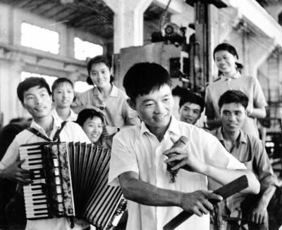 年輕的水運(yùn)憲隨廠宣傳隊(duì)送節(jié)目下車間時(shí)表演自編的快板書。常德電機(jī)制造總廠,湖南德山,約1970年。圖片由受訪者提供