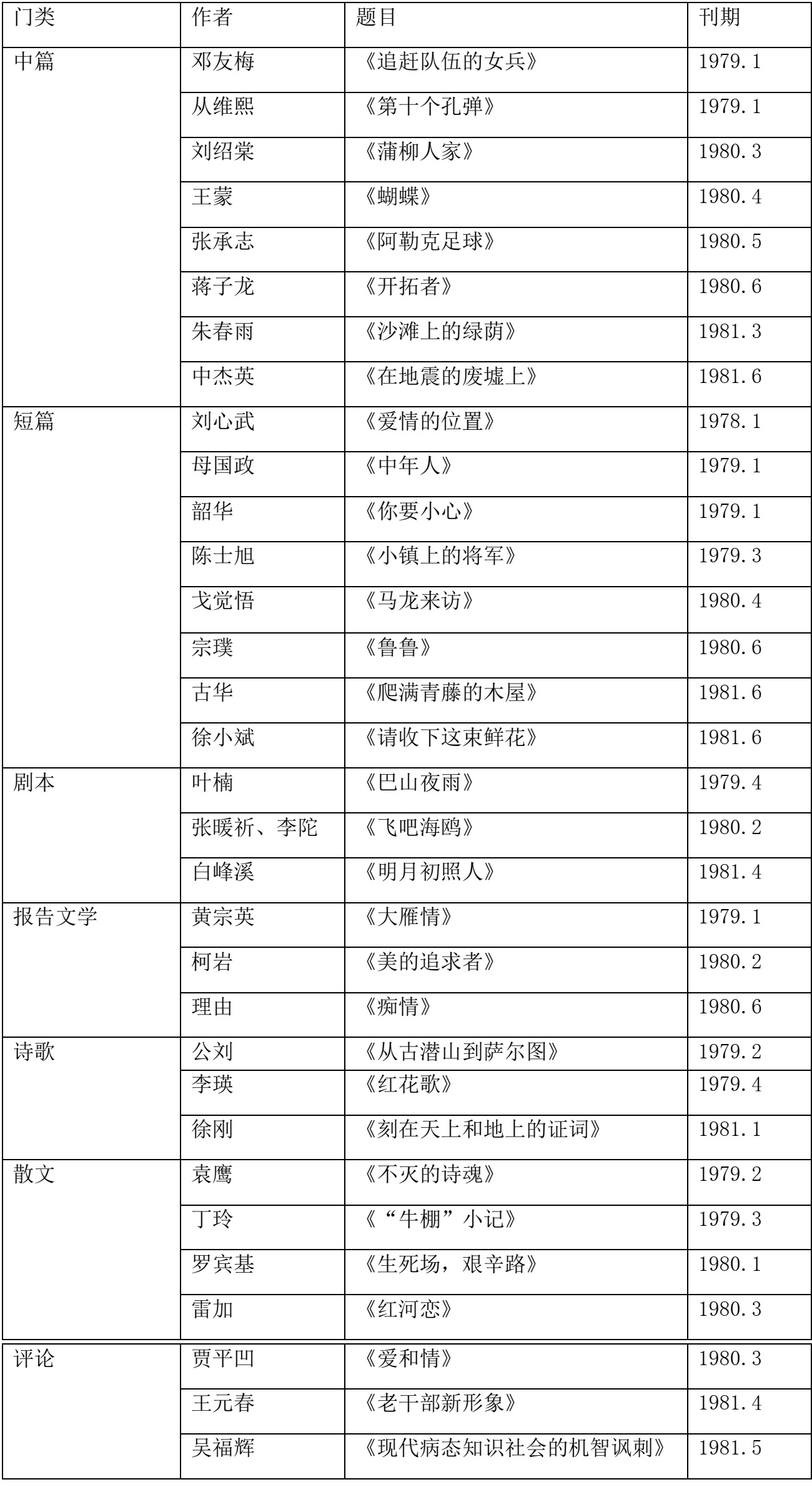表1:首屆《十月》文學(xué)獎獲獎作品(1978—1981)