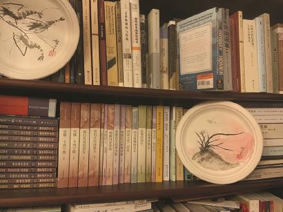 在我的書架上擺放著智量先生贈予的畫。那是幾年前他在上海第六人民醫(yī)院的病房里,畫在一次性的餐盤上的,兩幅蘭花,一束菊花,四只蝦,還有一幅無題畫:一只蝦被四只圍攻,遠(yuǎn)處的兩只急急地前來,它們各個身軀僨張,除了中間被圍攻的那只。我們稱它為“蝦(瞎)斗”圖。