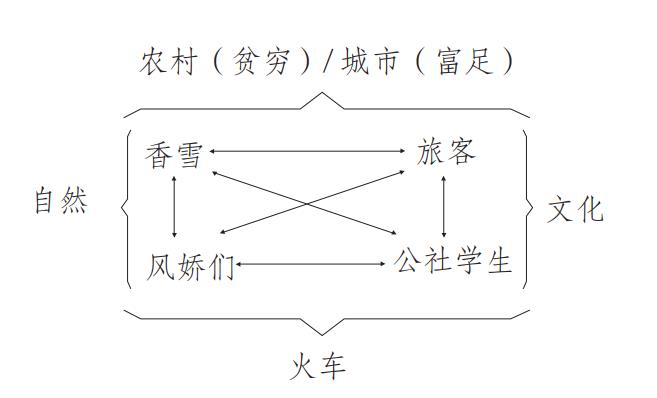 如圖所示,臺(tái)兒溝的香雪和鳳嬌們與城市的旅客(列車員)、公社同學(xué)處在分化、分離的兩極中。從語(yǔ)義角度看,香雪與旅客之間是一種對(duì)立關(guān)系,與公社同學(xué)之間是一種矛盾關(guān)系;鳳嬌們與香雪的公社同學(xué)構(gòu)成對(duì)立關(guān)系,與旅客構(gòu)成矛盾關(guān)系,她們處在既貧窮又沒有文化熏染的一個(gè)極點(diǎn)上。整個(gè)文本表意結(jié)構(gòu)建立在臺(tái)兒溝與城市之間的二元結(jié)構(gòu)關(guān)系上,二者又以火車為中介發(fā)生密切關(guān)聯(lián),調(diào)和矛盾,融合在一起。