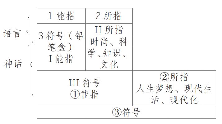 “現(xiàn)代神話”15意指作用的功能和機(jī)制是扭曲、變形、擴(kuò)張、交替,等等,它由此從符號(hào)學(xué)而進(jìn)入意識(shí)形態(tài)。羅蘭·巴特的“現(xiàn)代神話”理論對(duì)“解碼”《哦,香雪》中的鉛筆盒這一符號(hào)意涵具有方法論意義。為了闡釋得直觀、明晰,我們畫一個(gè)圖形如下:
