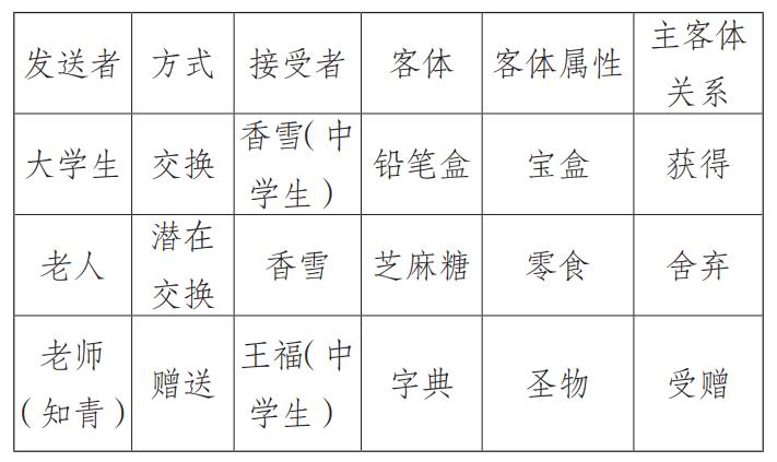 可以看出,無(wú)論是交換還是贈(zèng)予,發(fā)送者和接受者的關(guān)系是不對(duì)等的、由高到低的,即:大學(xué)生→中學(xué)生;老師(知青)→學(xué)生。除了身份(職業(yè))差異之外,二者合在一起看還有年齡差別:成年人→未成年人?!鞍l(fā)送者提供給接受者一個(gè)追尋的對(duì)象(客體),接受主體接收了這個(gè)對(duì)象(客體),于是在發(fā)送者和接受者之間就締結(jié)了一個(gè)契約?!?9鉛筆盒對(duì)于香雪而言不僅僅是一個(gè)物品、一個(gè)欲望客體的交換和傳遞,而且還是一種信息的交流和傳遞,更是一種價(jià)值的轉(zhuǎn)讓和流通。“在一個(gè)給定的價(jià)值觀世界里,價(jià)值像密封瓶一樣在流通?!?0在《哦,香雪》中,鉛筆盒無(wú)疑就是這樣的“密封瓶”。價(jià)值發(fā)送者胸前“礦冶學(xué)院”?;占仁且环N文化符碼又是一種象征符碼,1980年代初的大學(xué)生是“天之驕子”,大學(xué)?;占脑⒅幕矸莺椭R(shí)地位,而發(fā)送者的女大學(xué)生身份又象征了香雪的美好未來(lái)。這是一種深層結(jié)構(gòu)中的“契約關(guān)系”。