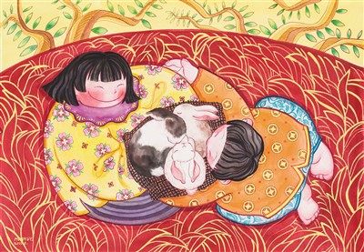 新年畫(huà)之新,不僅在主題內(nèi)容之新,也在于創(chuàng)意構(gòu)思的新穎、藝術(shù)表現(xiàn)手法的推陳出新。一些表現(xiàn)傳統(tǒng)主題的年畫(huà)作品,同樣讓人眼前一亮,呈現(xiàn)出鮮明的時(shí)代特征。今年的新作中有不少以生肖兔作為主題,比如《瑞兔呈祥》筆觸細(xì)膩,采用了裝飾藝術(shù)簡(jiǎn)潔的表現(xiàn)形式,營(yíng)造出空間感;《年年歲歲》在黃、橙、紅三色的喜慶基調(diào)中,中間添加人物手拿糖葫蘆,仿佛是喜慶年節(jié)的一次奇妙之旅,讓傳統(tǒng)抵達(dá)今天;《新生》則以迎接兔年為背景,描繪了一對(duì)母子在自然的美景中迎接一窩新生小兔的場(chǎng)景,畫(huà)中人物采取插畫(huà)的表現(xiàn)手法,人物和兔子都各自以圓形的輪廓進(jìn)行強(qiáng)化,傳遞出春節(jié)的團(tuán)圓氛圍和暖意融融。豐收一直是年畫(huà)的重要表現(xiàn)主題之一,豐收主題亦在今年的新作中占有相當(dāng)?shù)谋戎?。比如具有顯著江南水鄉(xiāng)風(fēng)格的《我們的小康生活》,采用工整細(xì)致的表現(xiàn)技法,細(xì)膩地描繪了江南古鎮(zhèn)的民居,以當(dāng)?shù)厝讼矏?ài)的舞獅、舞龍、擊鼓、玩船等喜聞樂(lè)見(jiàn)的形式慶祝豐收,以紅色調(diào)來(lái)表達(dá)人們喜悅的心情,紅火、熱情、喜悅,讓觀(guān)者可感可知。又如表現(xiàn)時(shí)令節(jié)氣主題的作品《春風(fēng)》,以獨(dú)特的俯視視角,從天空中飛舞的3只具有中國(guó)傳統(tǒng)美好寓意的風(fēng)箏,俯瞰在廣場(chǎng)上沐浴春風(fēng)的老老少少,洋溢著春天的活力與希望。