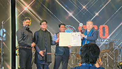 在印度孟買舉辦的上合組織國家電影節(jié)閉幕式上,中國駐印度使館工作人員(右一)代饒曉志領(lǐng)獎。