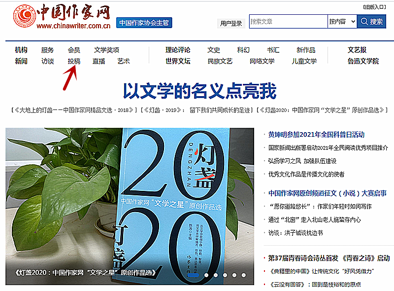 1、首先登錄中國(guó)作家網(wǎng)http://m.xpornx.net/ 在首頁(yè)頂端頻道分類位置找到“投稿”(標(biāo)紅色箭頭處),點(diǎn)擊進(jìn)入原創(chuàng)頻道。