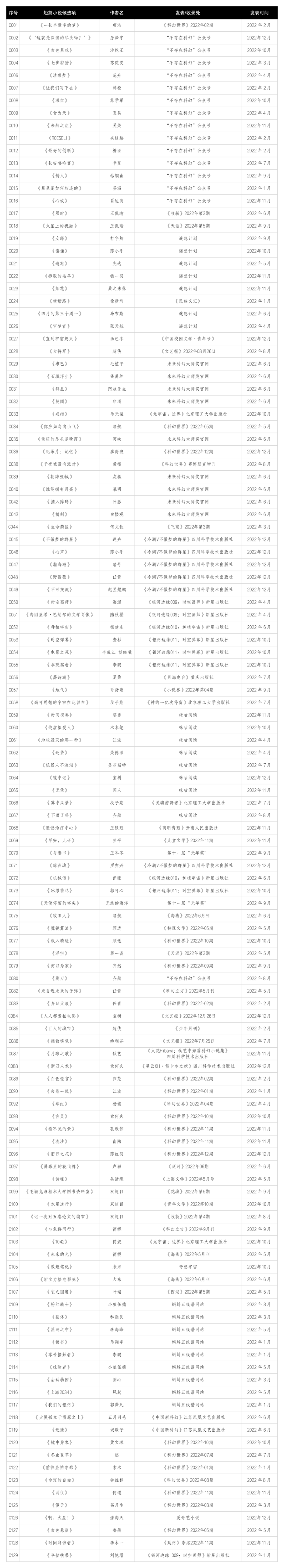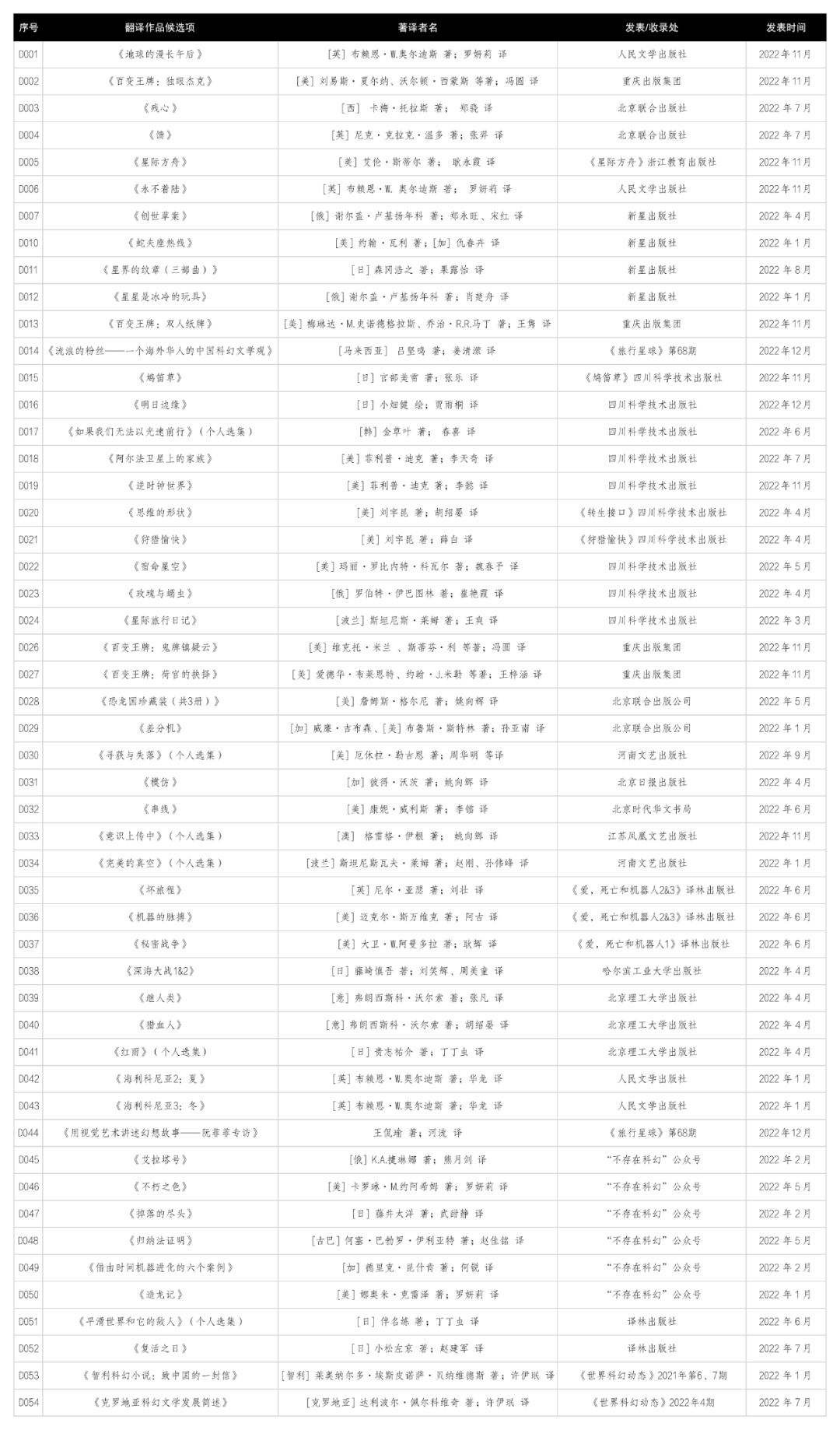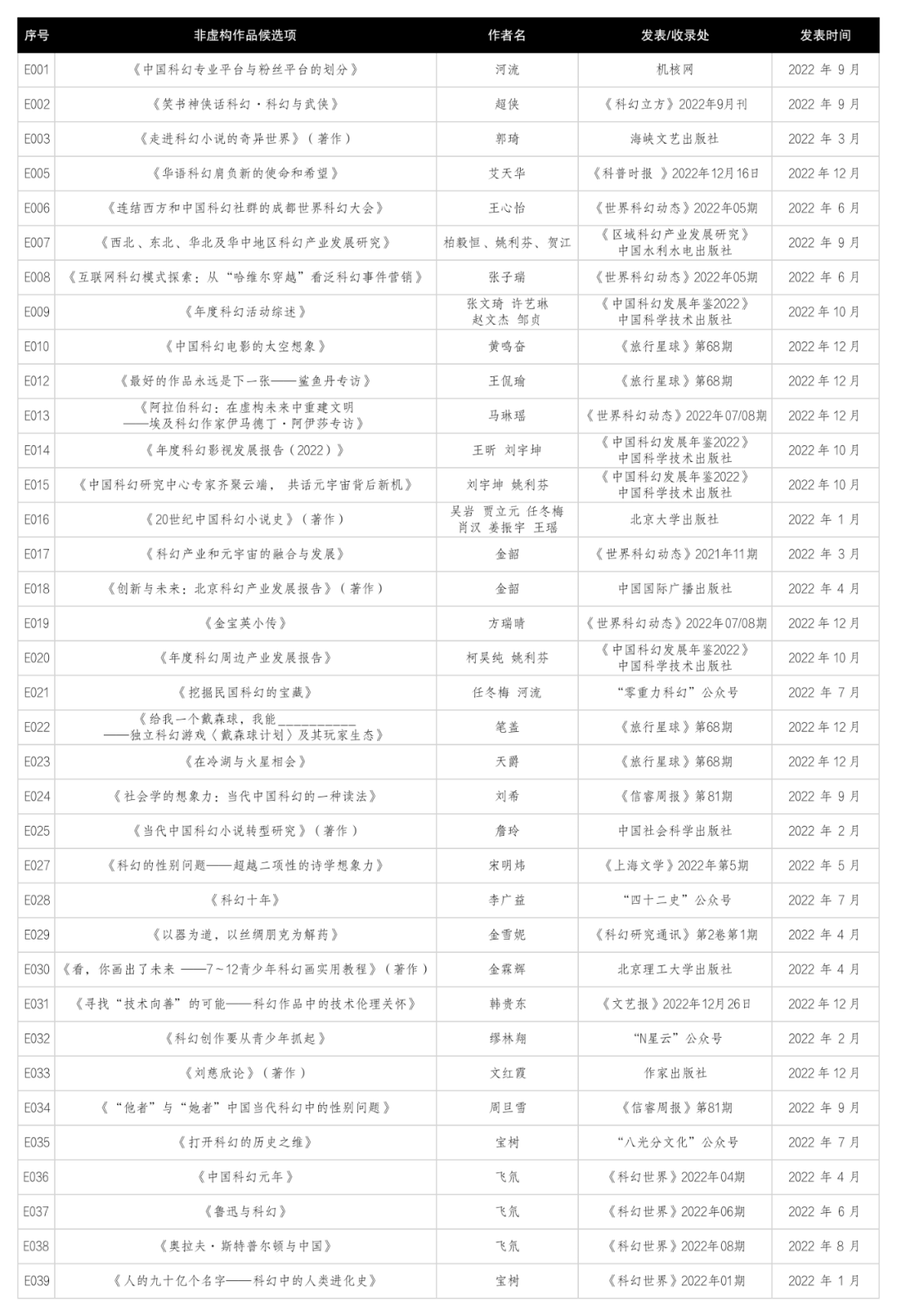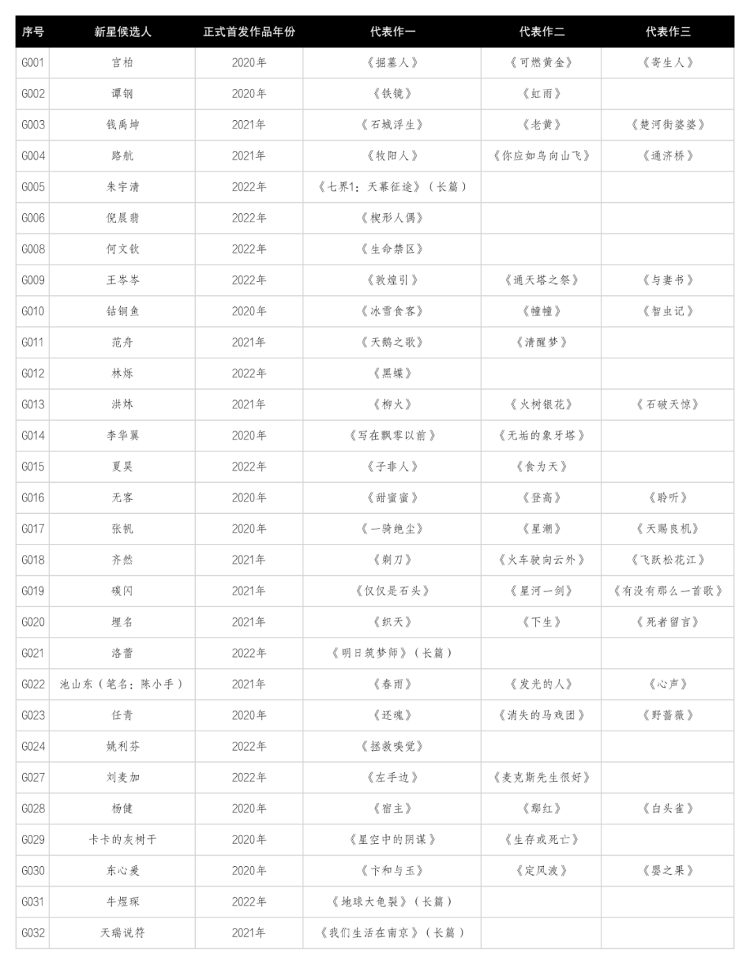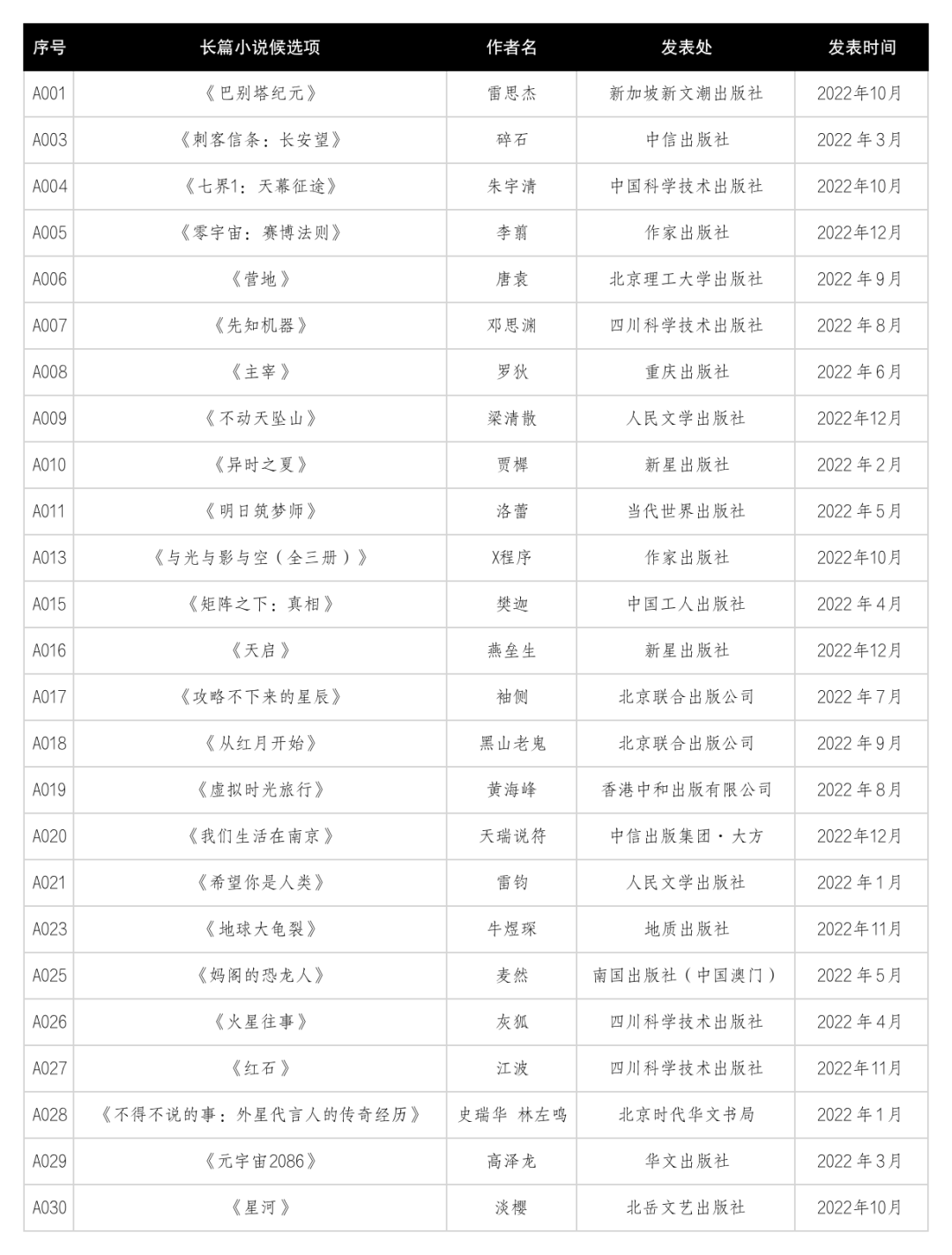自2022年11月21日至2023年1月31日止,在第十四屆華語科幻星云獎組織委員會的領導和薦選委員會的努力下,通過廣泛傳播、組織征集和重點邀約等多種方式,收到來自各個出版社、科幻文學類別的雜志社和一些科幻類的出品機構、非紙質專業(yè)平臺以及作者個人的推薦和自薦參評的作品和人選,共計392項申報,其中經查符合參評標準并通過候選資格復核的有長篇小說25項、中篇小說49項、短篇小說123項、翻譯作品51項、非虛構作品36項、評論42項、新星獎29人(不含其他專項獎、特別獎)。