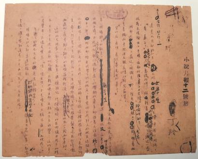 最后是編輯技術處理,也頗多未解之謎。稿紙每篇第一頁上鈐有“小說月報□□號用”的藍色印章,這不奇怪,是編輯部的用稿印證。但每頁上還有一個橢圓形的藍色印章,印文是“華字部公證圖章”,商務印書館印刷所有華字部、華英字部、西字部、中文校對部、西文校對部等等部門,但“公證”究為何用,卻不能很肯定。手稿上還留下編輯標注的排版格式,編輯術語稱為“劃版樣”。排版編輯的字,似乎是另一個人的字,但《莎菲女士的日記》的編輯修改更多,因為是日記體,每一天的上方,都標注字號:“五號方頭——”。其字體也與另兩篇的編輯字一致,這說明,這一篇的批改文字雖然與美編一樣用的是紅墨水,也有可能是葉圣陶的處理。當然,這些還都是值得進一步研究的。