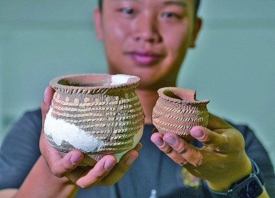 考古工作人員展示甘肅慶陽市南佐新石器時(shí)代遺址內(nèi)出土的箍白泥附加堆紋夾砂陶罐。 新華社記者 李賀攝