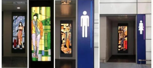 上海浦東機場衛(wèi)星廳中的衛(wèi)生間采用了彩色鑲嵌玻璃做壁畫標(biāo)識