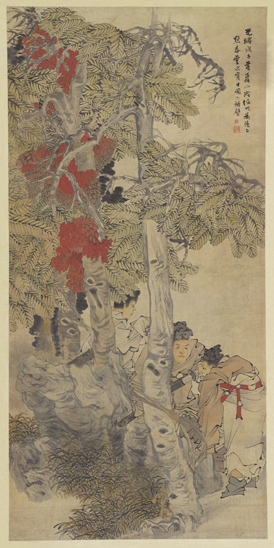 任畫多英雄氣,畫中英雄氣,千秋猶凜然,因此如何表現(xiàn)其“英雄氣”,是觀畫的一個(gè)關(guān)注點(diǎn)或重點(diǎn)。畫中撲入眼簾的,首先是那一樹紅色,是老樹上掛的藤蔓,紛披著紅花紅葉,燦爛照眼。而右下人物的紅腰帶與之相映,全圖生色。