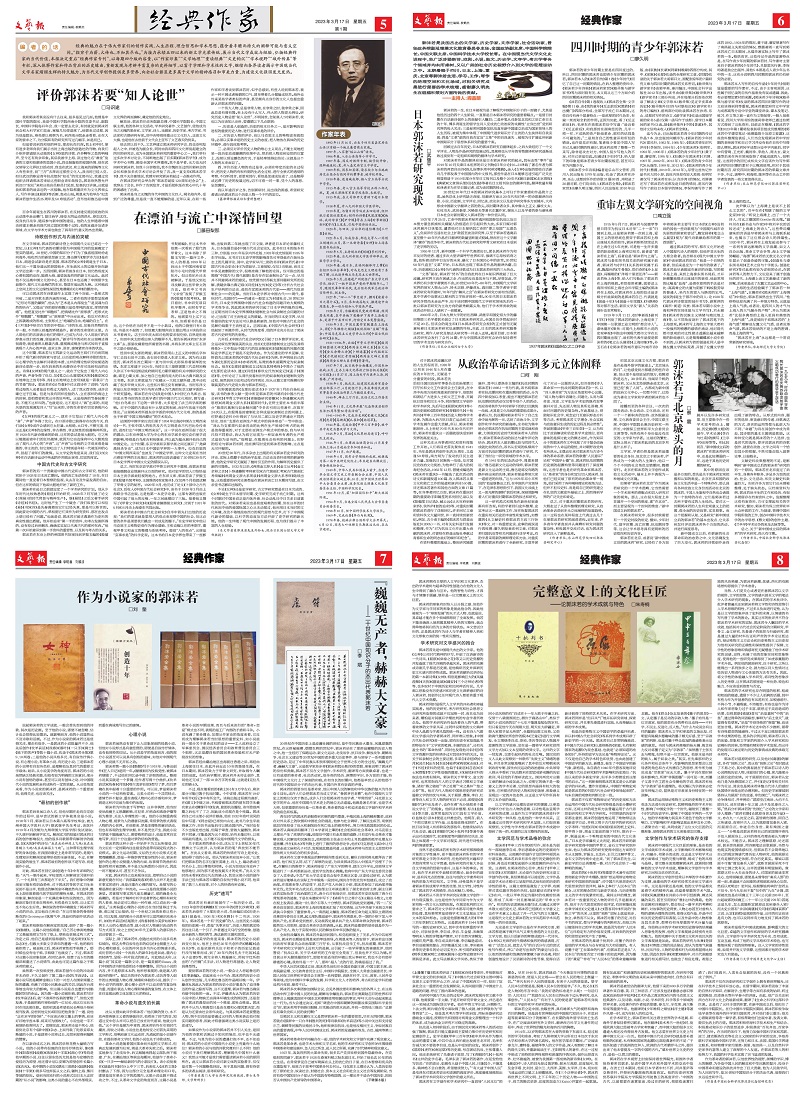 郭沫若是我國杰出的文學(xué)家、歷史學(xué)家、文字學(xué)家、社會活動家,曾任政務(wù)院副總理兼文化教育委員會主任、全國政協(xié)副主席、中國科學(xué)院院長、中國文聯(lián)主席、中國科學(xué)技術(shù)大學(xué)校長等。在中國現(xiàn)當(dāng)代文學(xué)文化史進(jìn)程中,他廣泛涉獵新詩、戲劇、小說、散文、歷史學(xué)、文字學(xué)、考古學(xué)等各個(gè)領(lǐng)域并均有所建樹,又以廣闊的社會歷史視野介入到文學(xué)的思想運(yùn)動之中。本期著眼于四川、日本、上海、重慶、北京等郭沫若生活、學(xué)習(xí)、工作、寫作的地理空間和文化場域,對相關(guān)研究成果進(jìn)行簡要的學(xué)術(shù)梳理,感謝廖久明先生在組稿和策劃方面所做的貢獻(xiàn)。