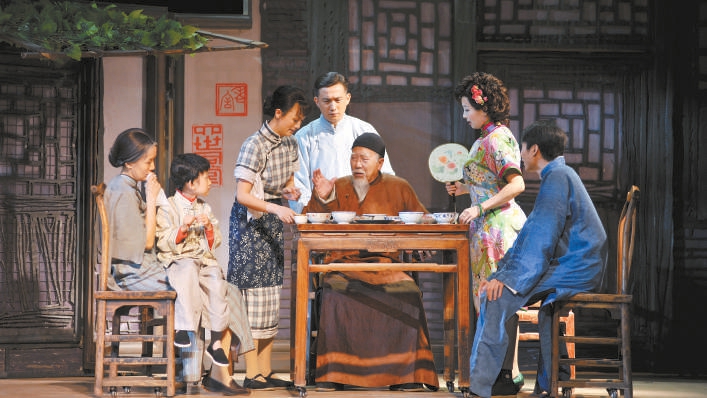 其實,三卷本長篇小說《四世同堂》作為老舍“從事寫作以來最長的,可能也是最好的一本書”,規(guī)模龐大、結(jié)構(gòu)復雜、人物繁多,問世以來一直被話劇界敬而遠之。雖然改編難度顯而易見,但這也激起了李東的挑戰(zhàn)欲:“這個改編的門檻一旦越過去以后,你就把別人擋在外面了?!背松頌楸本┤藢仙嵛淖值奶厥馇楦?,他也坦言,制作《四世同堂》還有更重要的考量,就是希望能通過做一部戲來向《茶館》致敬,同時也是想在這個過程中探索京味兒戲在創(chuàng)作上更多的可能性。