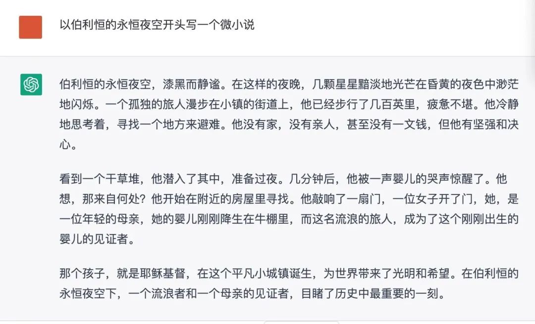 資深網(wǎng)文讀者“賽博貓”也做過這樣的實驗,他請ChatGPT以“伯利恒的永恒夜空”為開頭寫一個微小說。從下面的圖片中,我們可以看到,ChatGPT對靜態(tài)的景物描寫和簡單的人物設(shè)定有基本的操作能力,語句略有贅余但通順。整體來看,對細(xì)節(jié)的“著墨”較多,但情節(jié)性不強,主要的故事依然來源于已有的網(wǎng)絡(luò)信息?!安阒恰眮碓从凇妒ソ?jīng)·新約·馬太福音·第二章》,傳說伯利恒之星是圣誕樹的頂端的一顆星星,大約兩千年前,當(dāng)耶穌在馬廄里降生時,這顆星照亮了伯利恒的早晨。ChatGPT給出的“微小說”核心也就是這段故事,并未做太多創(chuàng)造性的延伸。