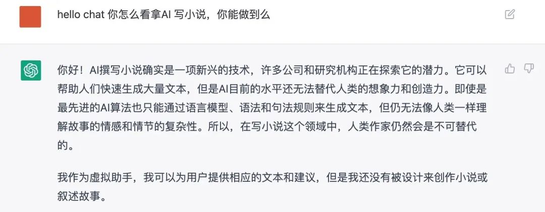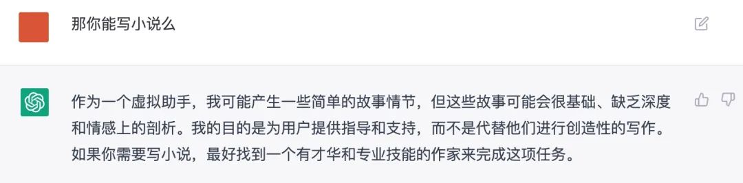 有趣的是,ChatGPT對自己能不能寫小說也有著自己的回答。