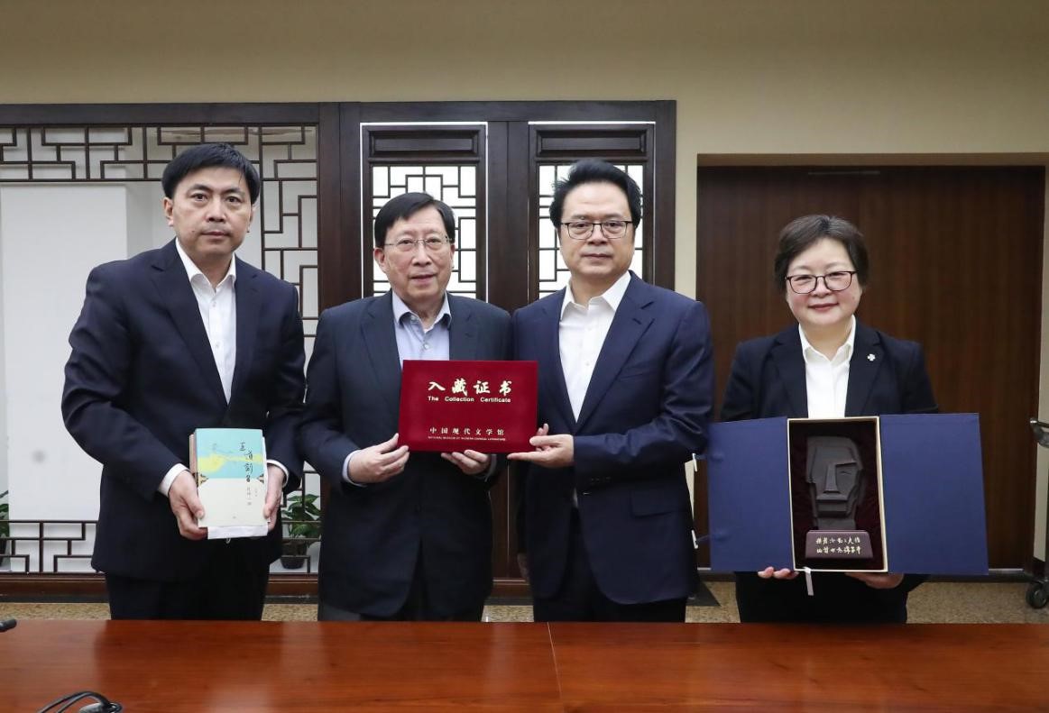 參觀結(jié)束后,舉辦了劉兆玄作品《王道劍》入藏現(xiàn)代文學(xué)館儀式。來訪的各位嘉賓紛紛表示,此次參訪內(nèi)容豐富,收獲滿滿,看到了中國(guó)現(xiàn)當(dāng)代文學(xué)波瀾壯闊的歷史,感受到了兩岸文學(xué)同宗同文的血脈親情。