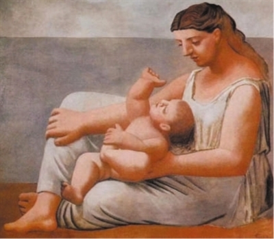 在畢加索藝術(shù)人生的“新古典主義”時(shí)期,他創(chuàng)作了大量擁有具象特征與古典美感的形象,其中以妻子奧爾加為藍(lán)本的畫作尤為出色。創(chuàng)作于1921年的《母與子》(見圖,李笑男供圖)描繪了畢加索的妻子與兒子,畫中人物具有豐沛的體量感,淡淡的藍(lán)色與白色色調(diào)突出人物溫暖的身體。在構(gòu)圖上,古典藝術(shù)中的水平與垂直關(guān)系占據(jù)主導(dǎo),賦予作品古典的質(zhì)樸與簡(jiǎn)潔。畫面背景僅由3個(gè)色帶組成,暗示了天空、海洋和未來(lái),與母親形象的幾何形態(tài)形成溫柔共振。母親的姿態(tài)加強(qiáng)了水平方向構(gòu)圖帶來(lái)的平衡感與秩序性,孩子活潑天真、自然擺動(dòng)的小腿則賦予寧?kù)o莊嚴(yán)的畫面以動(dòng)感。