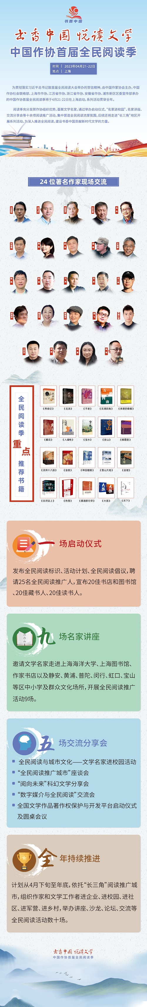 由中國作家協(xié)會主辦,中國作協(xié)社會聯(lián)絡(luò)部、上海市作家協(xié)會、江蘇省作家協(xié)會、浙江省作家協(xié)會、安徽省作家協(xié)會、浦東新區(qū)區(qū)委宣傳部承辦的中國作協(xié)首屆全民閱讀季將于4月21-22日在上海啟動,系列活動將貫穿全年。