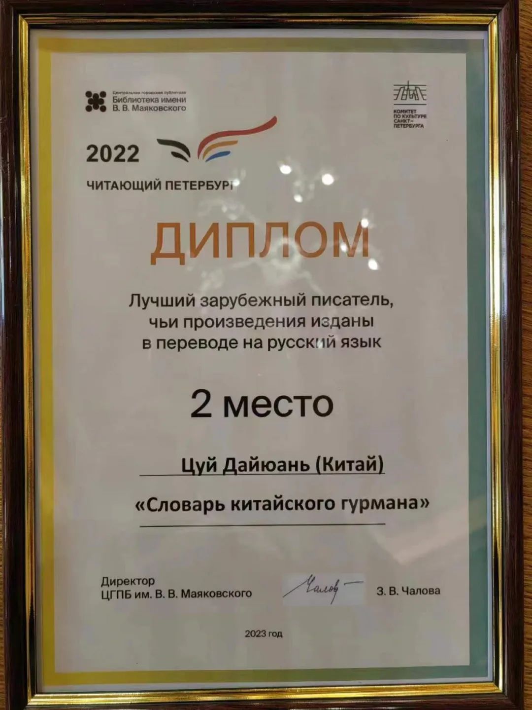 日前,由中國文字著作權(quán)協(xié)會代理輸出版權(quán),作家、文化學(xué)者、北京讀書形象大使崔岱遠(yuǎn)的《吃貨辭典》圖書俄文版榮獲俄羅斯馬雅可夫斯基中央市立公共圖書館(Центральная городсткая публичная библиотека имени В.В. Маяковского)頒發(fā)的“閱讀彼得堡:最佳外國作家”二等獎(Читающий Петербург:выбираем лучшего зарубежного писателя)。