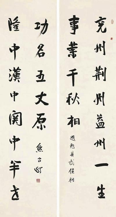 觀看《翰墨中華》展覽后,深感其特點(diǎn)之一是:詩(shī)書(shū)雙暢,珠聯(lián)璧合;文人書(shū)風(fēng),端雄清雅。其端雄的韻味往往以楷行的筆調(diào)、碑意的線條展示出器宇軒昂的正大氣象,如賞故國(guó)神游篇章中《題勉縣武侯祠》的龍門(mén)對(duì)“兗州荊州益州一生事業(yè)千秋相,隆中漢中關(guān)中半世功名五丈原”,聯(lián)莊詞工、字端氣雄,這幅作品堪稱(chēng)佳作。熊召政先生在故國(guó)神游篇中有一副對(duì)聯(lián)《題漢中石門(mén)陳列館》中寫(xiě)道:“天下英雄歸漢室,筆底風(fēng)濤入石門(mén)”,可謂詩(shī)書(shū)合璧,精神飛動(dòng),有氣韻酣暢,意精墨妙之豪趣。