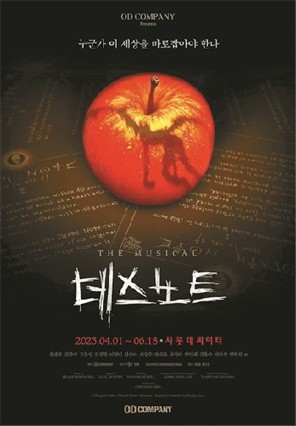 同樣在疫情期間進行了制作改進的還有音樂劇《死亡筆記》。這部日本漫改音樂劇于2015年首演,同年推出了韓國版,并于2017年進行了二輪演出。制作公司從2022年的第三輪演出時起,對該劇的舞美進行了全面升級:之前版本的舞臺實景幾乎全部消失,只保留了一些簡單的桌椅;舞臺的天花板、背幕及地板鋪設(shè)了1340 塊LED屏幕,所有布景都由LED 屏上的動態(tài)多媒體完成;三臺激光投影儀共同運轉(zhuǎn),以點、線、面勾勒出不同的透視關(guān)系和舞臺氛圍,在場景中迅速切換,或劃分舞臺空間,或配合人物動線以及視角,仿佛魔法一般。