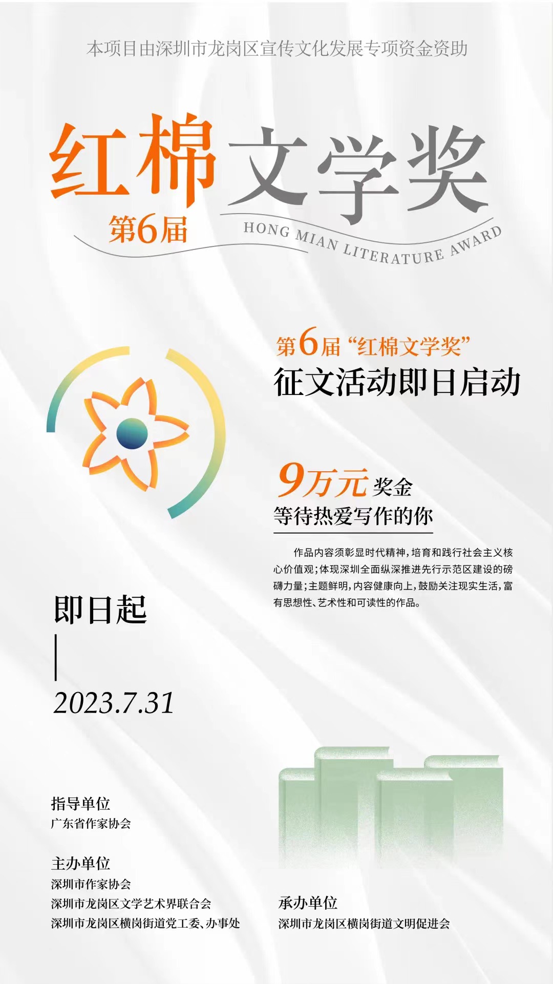 第六屆“紅棉文學(xué)獎”是深圳市龍崗區(qū)宣傳文化發(fā)展專項資金資助項目,由廣東省作家協(xié)會指導(dǎo),深圳市作家協(xié)會、龍崗區(qū)文學(xué)藝術(shù)界聯(lián)合會、中共深圳市龍崗區(qū)橫崗街道工作委員會、深圳市龍崗區(qū)橫崗街道辦事處聯(lián)合主辦,真誠歡迎所有漢語寫作者踴躍投稿。