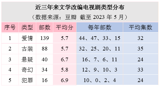 在網(wǎng)絡(luò)推薦評(píng)分平臺(tái)上,共收錄近三年播出的文學(xué)改編劇集264部,2020年有90部,2021年有74部,2022年有64部,2023年有36部(截至5月)。其中愛情劇占比最高,達(dá)52.7%;其次是古裝劇,達(dá)33.3%;再次是懸疑與奇幻,分別占15.2%和12.9%(注:部分作品從屬于多個(gè)類型)。就平均制作集數(shù)而言,文學(xué)改編作品32集的平均集數(shù)明顯高于國(guó)產(chǎn)劇27集的平均集數(shù)。其中,愛情劇平均集數(shù)為32集,與總體持平;懸疑劇平均為24集,體現(xiàn)出短而精的特點(diǎn);古裝劇較其他類型的平均集數(shù)更長(zhǎng),為35集;再精確到歷史劇,其平均集數(shù)則更長(zhǎng),為53集,以78集的《大秦賦》、70集的《清平樂》和61集的《大宋宮詞》為代表。
