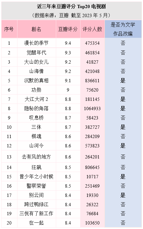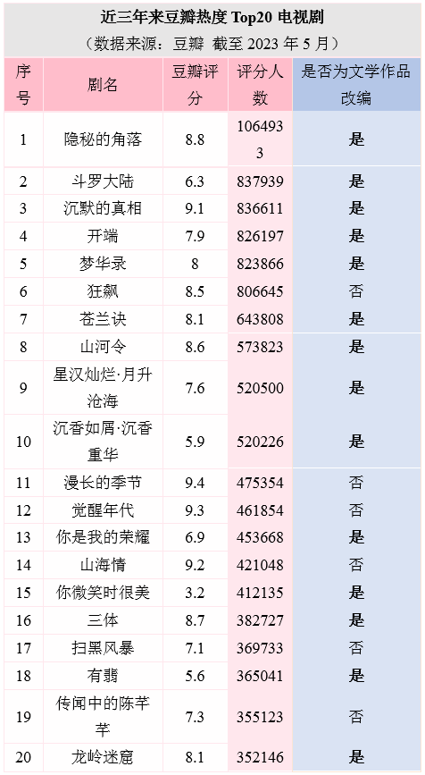 綜合考量豆瓣評(píng)分與評(píng)分人數(shù),近三年評(píng)分前20名的國(guó)產(chǎn)劇中,文學(xué)改編作品有7部,占比為35%。個(gè)別作品可能有改編之實(shí)但未公開認(rèn)定者未計(jì)入內(nèi)。2020年,《沉默的真相》《隱秘的角落》《大江大河2》《別云間》四部文學(xué)改編作品進(jìn)入豆瓣評(píng)分前10名。21年評(píng)分前10名中有1部,為《山河令》。2022年評(píng)分前10中,有《人世間》《風(fēng)吹半夏》《風(fēng)起隴西》《蒼蘭訣》,共4部。2023年評(píng)分前10名中,有4部文學(xué)改編作品(截至2023年5月)。 僅僅從豆瓣評(píng)分來看,優(yōu)秀的文學(xué)改編影視作品,總體影響力尚不能完全與原創(chuàng)影視作品分庭抗禮。