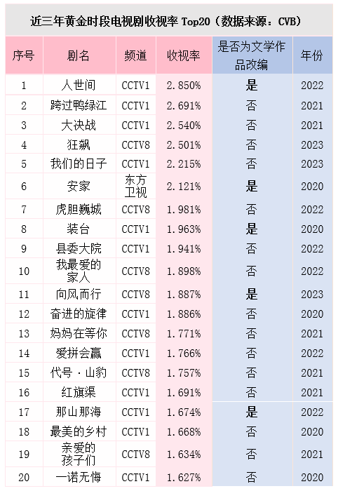 3.電視黃金時(shí)段收視TOP20中的文學(xué)改編占比:25%