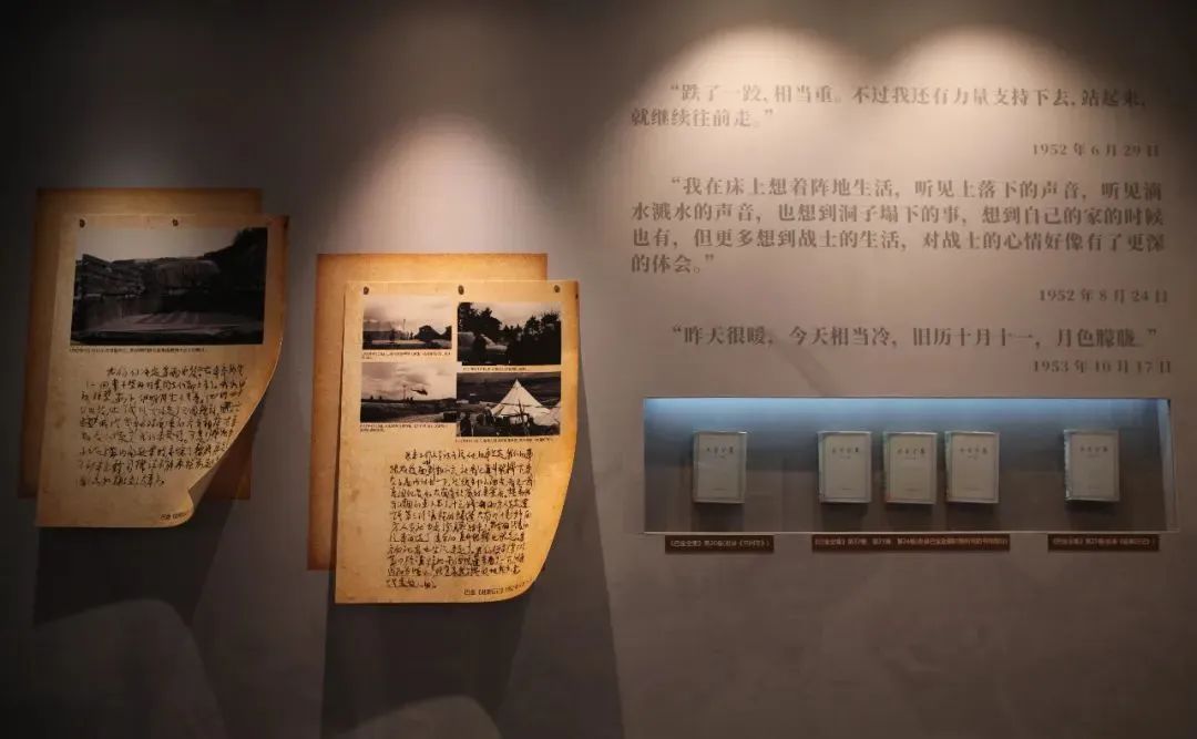 本次展覽共展出巴金的《赴朝日記》原件、魏巍的《誰(shuí)是最可愛(ài)的人》手稿等233件文物,分五個(gè)單元展陳。第一單元“問(wèn)蒼茫大地 誰(shuí)主沉浮”,主要展示蕭三《毛澤東同志的青少年時(shí)代和初期革命活動(dòng)》《抗日軍政大學(xué)》《在棗園過(guò)年》三部著作的手稿。同時(shí)展出的還有毛澤東《浣溪沙·和柳亞子先生》原文、畫(huà)家高泉的油畫(huà)《決策出兵》等。第二單元“誰(shuí)是最可愛(ài)的人”,《誰(shuí)是最可愛(ài)的人》手稿亮相其中。這是作家魏巍從朝鮮戰(zhàn)場(chǎng)歸來(lái)后所著的報(bào)告文學(xué),最先于1951年4月11日在《人民日?qǐng)?bào)》刊登,后入選中學(xué)語(yǔ)文課本,影響了數(shù)代中國(guó)人。魏巍長(zhǎng)篇小說(shuō)《東方》手稿、自壽詩(shī)原件也一并展示。第三單元名為“英雄兒女”?!胺闊煗L滾唱英雄,四面青山側(cè)耳聽(tīng)……”一首蕩氣回腸的《英雄贊歌》至今仍在傳唱,而這首歌曲的出處,電影《英雄兒女》更是一代人的回憶。鮮為人知的是,這部電影是根據(jù)巴金的中篇小說(shuō)《團(tuán)圓》改編而成。本單元展出了巴金的《團(tuán)圓》手稿復(fù)制件、《生活在英雄們的中間》校樣等。第四單元“上甘嶺”,展出“中國(guó)電影編劇終身成就獎(jiǎng)得主”、曾作為中國(guó)人民第二屆赴朝慰問(wèn)團(tuán)成員的陸柱國(guó)的長(zhǎng)篇小說(shuō)《上甘嶺》油印修改稿。還展出了《上甘嶺》電影劇本和《林杉上甘嶺采訪(fǎng)筆記》。第五單元“我同祖國(guó)在一起”。本單元為群像單元,展示了黃谷柳、李蕤和舒群《赴朝日記》的原件。本區(qū)域?qū)⒆骷尹S谷柳兩次赴朝拍攝的朝鮮戰(zhàn)地寫(xiě)真集錦制作成巨幅照片墻。70張照片,70個(gè)瞬間,引導(dǎo)觀(guān)眾走向歷史、走向前輩心靈、走向大時(shí)代的風(fēng)云。