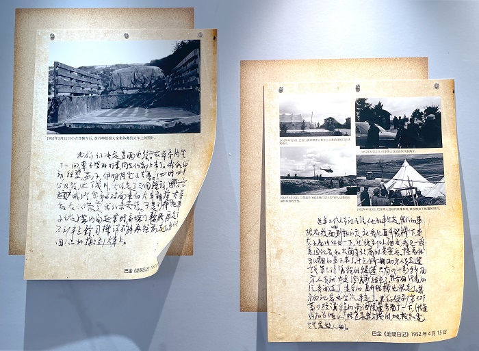 走至第五單元“我同祖國在一起”,一大面巨幅照片墻映入眼簾,這是作家黃谷柳拍攝的中國作家、藝術(shù)家赴朝慰問志愿軍的寫真集錦。黃谷柳曾兩次赴朝,用手中的相機記錄下朝鮮前線無數(shù)的感人瞬間。本單元精選了他在前線捕捉到的70個動人瞬間,引人回望壯闊的時代歲月和颯爽的英雄風(fēng)姿。此外,李蕤、舒群的《赴朝日記》原件、家書,志愿軍戰(zhàn)士寫給黃谷柳的書信,巴金懷念與黃谷柳共赴朝鮮的便箋等也在此單元展出。舒群的兒子李霄明特意帶來了父親的另一本日記原件,他表示,今年也是父親誕辰110周年,父親是一位愛國者和作家,他留下的日記正在整理中,不久將公開發(fā)表。這些日記真實記錄了抗美援朝戰(zhàn)爭的嚴酷,非常有價值。