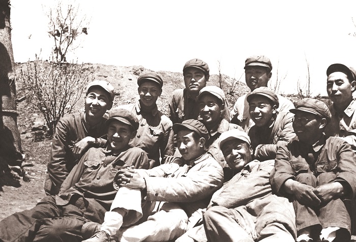 1953年,黃谷柳(左一)與志愿軍戰(zhàn)士合影留念