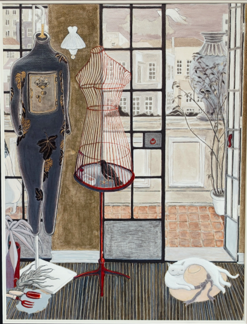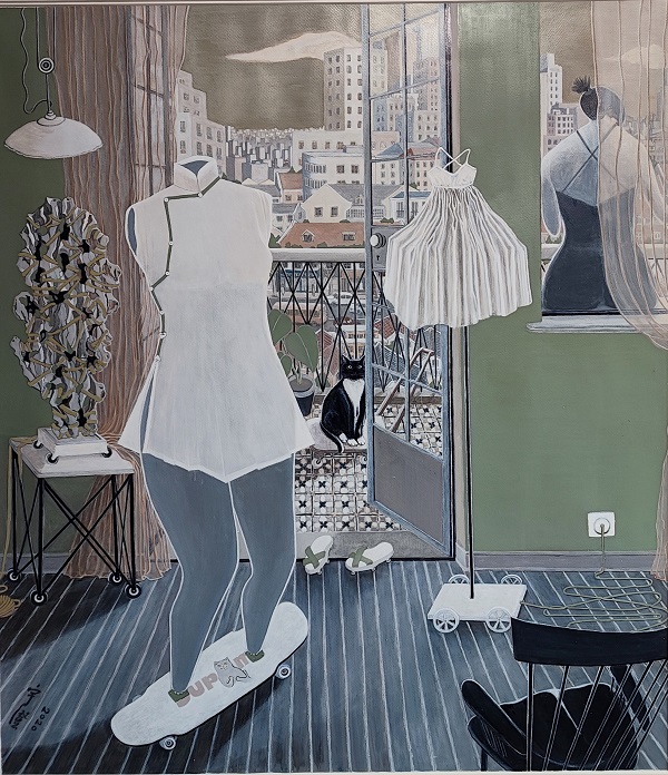 金宇澄的近作《陽臺》,這張作品取自1940年代鄔達克設(shè)計的“愛神花園”,也是金宇澄最熟悉的上海作家協(xié)會局部,提供另一種觀看世界的特殊樣式。透過窗格望向街道對面的洋房,房間里面的模特衣架猶如被剝?nèi)ネ庖碌某嗦隳信⒃陉柵_的門前,而豐滿女模特衣架被做成了鳥籠,一只烏鴉安靜地站在鳥籠里面,鳥籠外面是慵懶的白貓在打盹兒,氣宇軒昂的一對模特衣架仿佛是要出門參加派對的紅男綠女,殘敗的蕨類植物被凌亂無序地切割下來,扔在精致的地毯上面。