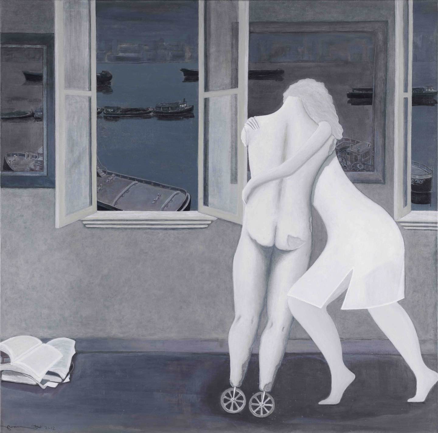 《北風(fēng)》為俯瞰上海大廈背面那整幅街景,與一般表現(xiàn)不同,體現(xiàn)鱗次櫛比的城市魅力,是在黑白灰的配色中,亦真亦幻,意味異常繁復(fù),屏風(fēng)式的三聯(lián)畫,沒有光影,幾乎都是平面,卻也很立體。白雪覆蓋的城市顯現(xiàn)一種童話式的不真實、不對應(yīng)的恍惚感,安靜的車道,兩旁店面和樓房,仿佛都在夢中?!澳敲炊嗟膮柡θ宋铮紩淼竭@座城市,上海是個大染缸,是真的,只要他來這里生活,就會染上它的特征,畫中的每一棟樓,每座公寓,每扇窗戶背后,在發(fā)生著一些什么,你知不知道?你不知道?!辈恢赖氖?,最有意思。