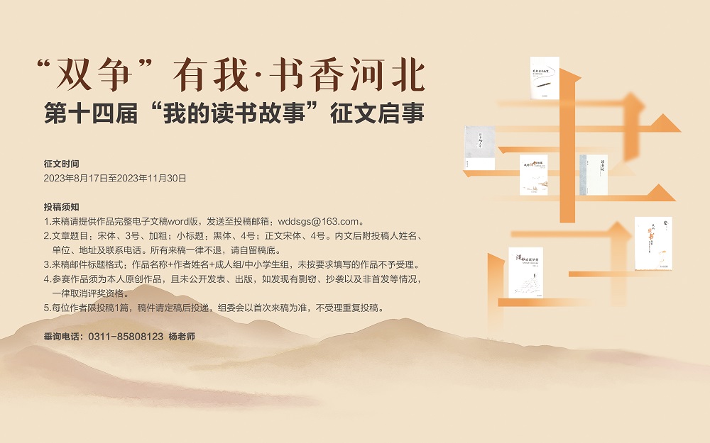 為推動全民閱讀,營造“雙爭”有我·書香河北濃厚氛圍,河北省作家協(xié)會、河北日報報業(yè)集團聯(lián)合舉辦第十四屆“我的讀書故事”征文活動。愿讀書滋養(yǎng)智慧心靈,開啟人生夢想,點亮美好生活,請您拿起筆來,寫下獨屬于您的讀書故事。