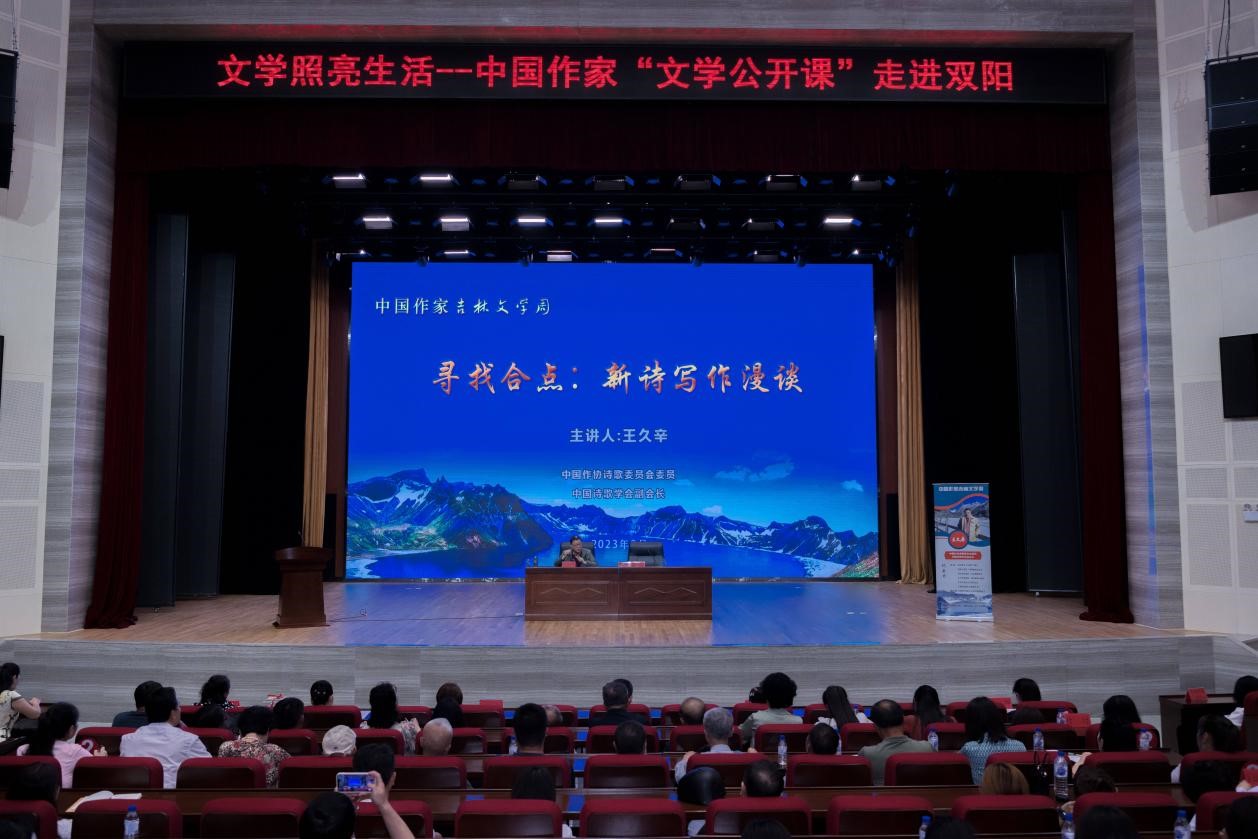 在長春雙陽區(qū)委黨校大教室,王久辛以“尋找合點(diǎn):新詩寫作漫談”為題,結(jié)合個(gè)人創(chuàng)作經(jīng)歷,向現(xiàn)場的文學(xué)愛好者們闡釋了新詩創(chuàng)作如何尋找“合點(diǎn)”、怎樣就“合點(diǎn)”寫出有爆發(fā)力的好作品等話題,并分享了自己在詩歌創(chuàng)作中的感悟和體會。他以自己創(chuàng)作長詩《朱凡》《大地夯歌》《零刻度》《肉搏的大雨》《初戀杜鵑》時(shí)的創(chuàng)作歷程為切入點(diǎn),指導(dǎo)大家在詩歌創(chuàng)作中要注重“寫境”和“造境”,并把修辭和邏輯作為詩歌創(chuàng)作的基本功。大家就詩歌的創(chuàng)作要求、評判標(biāo)準(zhǔn)以及詩歌的時(shí)代責(zé)任與擔(dān)當(dāng)?shù)葐栴}提問,王久辛一一給予解答,并鼓勵(lì)文學(xué)愛好者們要立足本土文學(xué),堅(jiān)定文化自信,創(chuàng)作出具有地域特色、彰顯文化擔(dān)當(dāng)?shù)募炎鳌?/p>