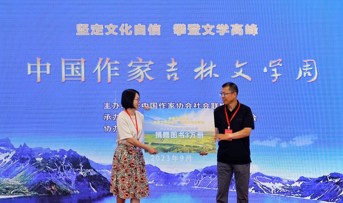 文學(xué)周期間,開展了“新時(shí)代山鄉(xiāng)巨變文學(xué)與你同行”圖書捐贈(zèng)活動(dòng)。中國作協(xié)社聯(lián)部聯(lián)合中華文學(xué)基金會向舒蘭市、汪清縣的46所中小學(xué)校頒發(fā)“育才圖書室”牌匾,捐贈(zèng)各類圖書6萬冊,價(jià)值約200萬元,給學(xué)生們送去精神食糧和關(guān)懷,讓優(yōu)秀文學(xué)作品陪伴孩子們的成長。