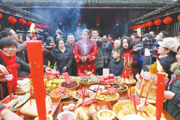 如今,朝北臺門已成為浙江省打造的鄉(xiāng)村博物館之一,向世人展現(xiàn)魯迅作品中紹興的風土人情和令他回味的快樂童年。會客廳里的大屏幕上,演著小說《祝?!防锏哪杲K大典;墻上、案頭的小喇叭,用紹興話講著魯迅兒時聽的故事;餐桌上,擺滿了少年魯迅常吃的釀面筋、津菜魚松、慈姑臘肉等“菜肴”。