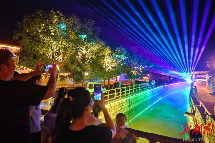 河南省林州市黃華鎮(zhèn)廟荒村,游客在欣賞水上燈光秀。近年,該村圍繞太行山民居特點,打造“渠畔人家”景觀帶,蝶變?yōu)檫h(yuǎn)近聞名的“網(wǎng)紅村”,駛?cè)肓肃l(xiāng)村振興的快車道。 湖南日報全媒體記者 徐行 攝