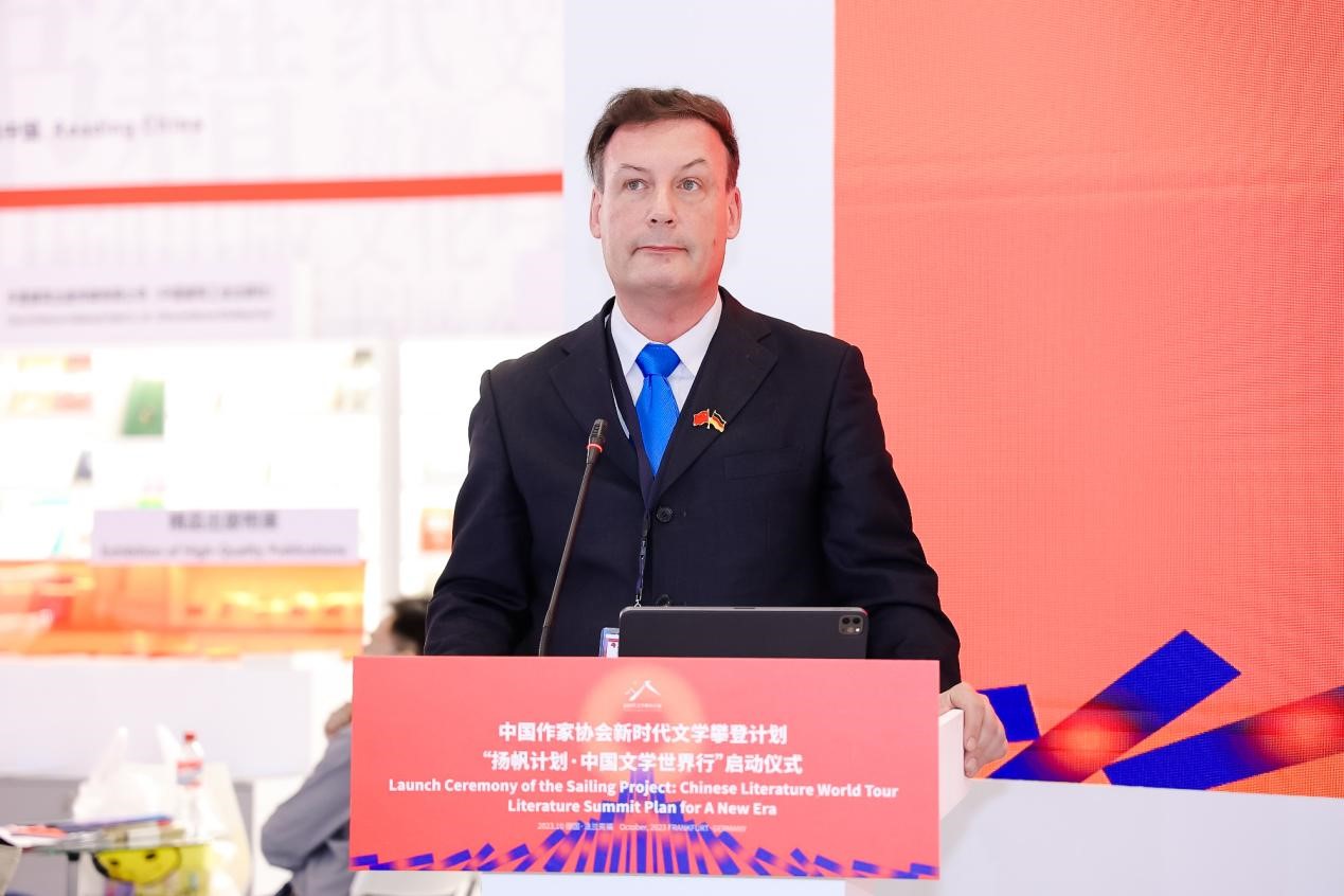 10月19日,在法蘭克福舉行的“新時代文學(xué)攀登計劃·揚(yáng)帆計劃”之“中國文學(xué)世界行”啟動儀式暨圖書版權(quán)簽約儀式上,來自中外的出版人和作家匯聚一堂,打造中國作家海外傳播集群,促進(jìn)形成中國文學(xué)圖書版權(quán)輸出矩陣,講好中國故事,讓海外通過中國當(dāng)代文學(xué)了解可信、可愛、可敬的中國形象,推動中國文化更好地走向世界?;顒蝇F(xiàn)場,法蘭克福書展副主席柯樂迪,中國駐法蘭克福總領(lǐng)館總領(lǐng)事黃昳揚(yáng),中國作家協(xié)會副主席李敬澤,中宣部出版局局長馮士新,中國作家協(xié)會創(chuàng)研部主任何向陽,中國出版集團(tuán)有限公司黨組成員、中國出版?zhèn)髅焦煞萦邢薰靖笨偨?jīng)理張紀(jì)臣,中國圖書進(jìn)出口(集團(tuán))有限公司總經(jīng)理林麗穎共同啟動 “新時代文學(xué)攀登計劃·揚(yáng)帆計劃”之“中國文學(xué)世界行”項(xiàng)目。